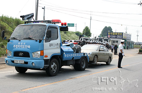 ▲ 경찰은 집회 진압을 위한 공간 확보를 위해 주차된 차를 견인했다. |