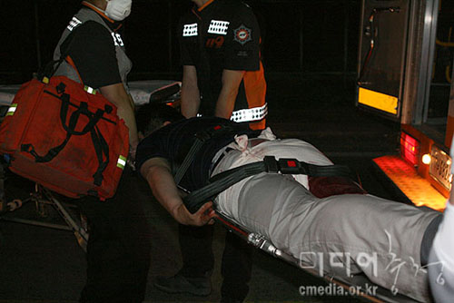 ▲ 6월 17일 밤 9시 15분경, 119 구급차가 유성기업 아산정문에 도착했고 곧이어 붕대로 칭칭 감았음에도 불구하고 오른쪽 엉덩이와 허벅지가 피로 흥건히 젖은 영업부 소속 김 씨가 공장안에서 실려나왔다. 유성기업지회는 장시간 노동과 미숙련공 투입에 따른 안전사고라고 주장했지만, 회사는 공식 답변하지 않았다. |