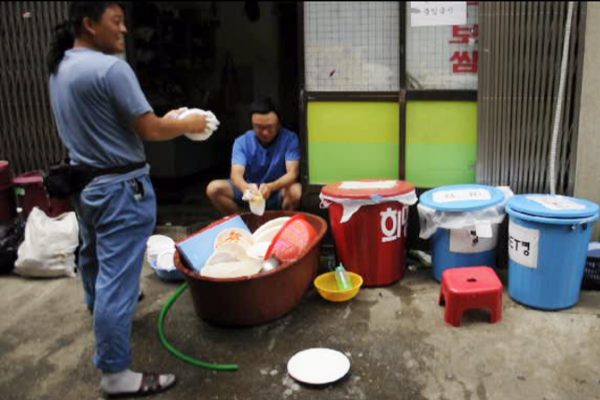 ▲ 정투위 사무실에서 식사시간이 끝난 뒤 선 채로 그릇을 닦는 장창근 조합원. |