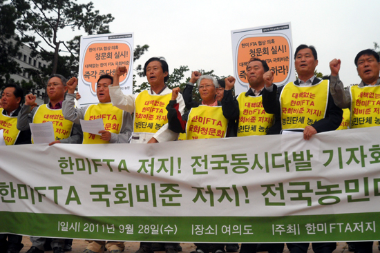 한편, 10월 6일 FTA비대위는 국회비준을 저지하기 위한 농어민 대회를 개최할 예정이다. 오늘 단식농성 돌입 기자회견이 여의도에서 열린 가운데 농민단체들은 전국 동시다발로 한미FTA 국회비준 반대 기자회견을 개최할 예정이다.