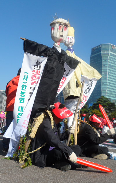 지난달 28일부터 여의도 국민은행 앞에서 농성중인 이광석 전국농민회총연맹 의장은 “김종훈 통상교섭본부장이 죽을힘을 다해 싸웠노라고 미 버시바우 대사에게 말했다고 한다. 누구를 위해 죽을힘을 다해 싸웠나. 재벌과 미국의 입장만 옹호하는 정부와 통상관료들에게 농민들이 본때를 보여주자”고 말했다.
