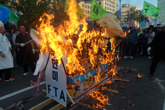 행진을 멈춘 참석자들은 여의도 국민은행앞 차도에서 경찰 차벽을 앞에 두고 한미FTA상여 화형식을 진행했다. 경찰은 화형식 진행과 동시에 소화기를 분사해 취재중인 기자와 농민들이 소화분말을 덮어 쓰기도 했다.