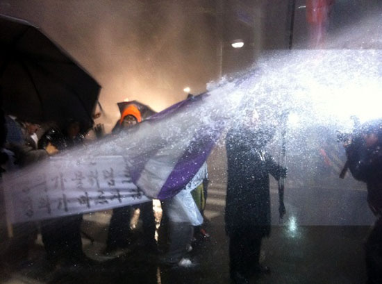 22일 한미FTA 비준안 날치기 통과 후 이에 반발한 시민들은 촛불을 들고 비준무효를 주장하며 거리에 나섰다. 경찰은 시민들의 행진을 물대포를 쏘며 저지했다. 23일에도 경찰은 물대포를 시민들을 향해 직사했다.