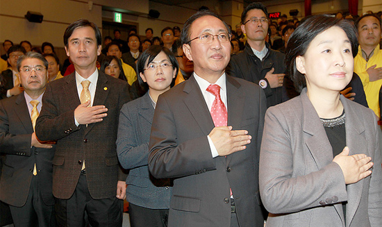 ▲ 지난 12월 4일 국민참여당 마지막 공식행사인 임시전국당원대회에서 국기에 대한 경례를 하고 있다. [출처: 국민참여당] |