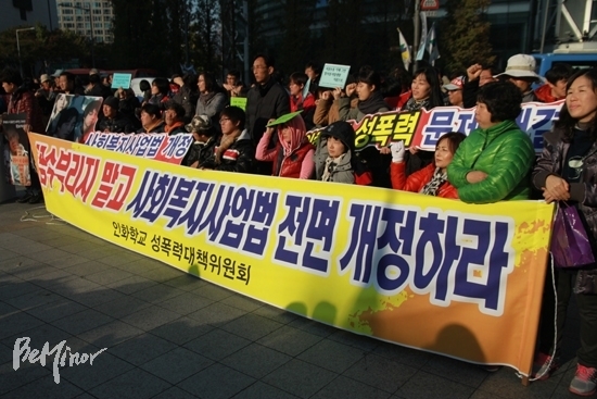 ▲ 인화학교 성폭력대책위원회 소속 활동가들이 사회복지사업법 개정을 촉구하는 모습. |