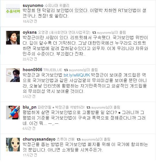 만약 정봉주 의원을 비롯한 정치인들이 트위터를 통해 북한 계정의 트윗을 리트윗 한다고 해서 그들에게 국보법이 적용될 가능성은 희박하다. 하지만 박 씨를 비롯한 일반인들은 알 수 없다. 언제든 국보법은 말도 안 되는 이유로 시민들을 억압해 올 수 있다.