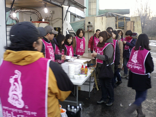 지난해 여름 내내 봤던, 진보신당의 밥차는 벌써 많이 낡아 곳곳에 땟국물이 줄줄 흐른다. 그래도 오곡밥에 육개장이 넘쳐난다. 점심을 굶었기에 우선 줄부터 섰다. 100명 가량의 뚜벅이들이 분홍색 몸벽보를 두른 채 놀고 있다. 내일(6일)이 정월대보름인데 하루 당겨 공장 마당엔 달집이 세워졌고, 쥐불놀이도 빙빙 돈다.