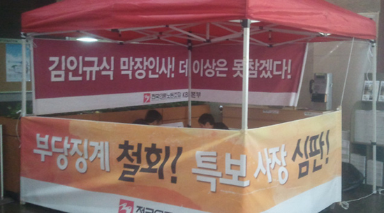 ▲ 징계된 조합원 13명이 지난 1일부터 KBS신관 로비에 천막을 치고 농성을 시작했다. [출처: KBS 새노조] |