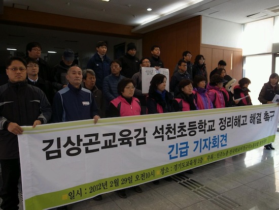 학비노조 경기지부와 민주노총 경기도본부는 29일 오전 10시 30분경 경기도 교육청 로비에서 ‘석천초등학교 고용안정 정리해고 해결’을 위해 김상곤 교육감이 나서야 함을 촉구하는 긴급기자회견을 열었다.