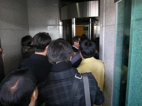 ▲ 29일 오전 10시 경기도교육청 로비에서 기자회견을 하려 하자 교육청 직원들이 참가자들을 제지해 몸싸움이 일어 났다. 이로 인해 기자회견이 30분 가량 지체됐다. |