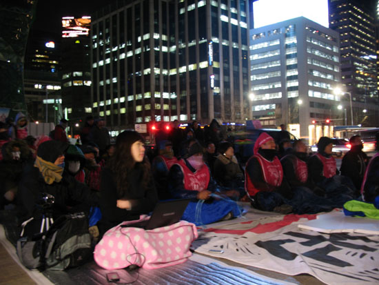 지난 10일부터 서울시청앞 광장에서 무기한 농성에 돌입한 희망광장은 매서운 꽃샘추위 속에서 농성 3일차를 맞이했다. 영하를 웃도는 추운 날씨에도 경찰의 천막반입 불허로 인해 이들은 스티로폼과 비닐로 바람을 막으며 농성을 이어가고 있다.