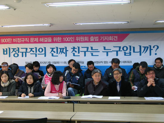 100인 위원회는 13일 오전 민주노총 회의실에서 기자회견을 통해 “비정규직의 가짜 친구들이 판치고, 온갖 가짜 공약들이 난무하는 혼돈의 계절에, 몸바쳐 싸워왔던 비정규직 노동자들과, 연대했던 이들이 모여 벼랑 끝에서 절망하고 있는 900만 비정규직 노동자들의 희망이 되도록 하겠다”라며 발족 취지를 설명했다.