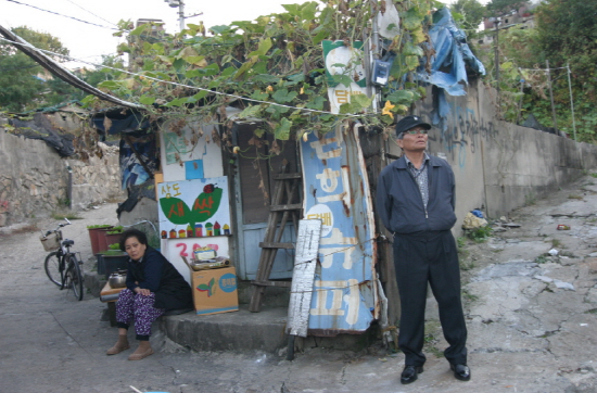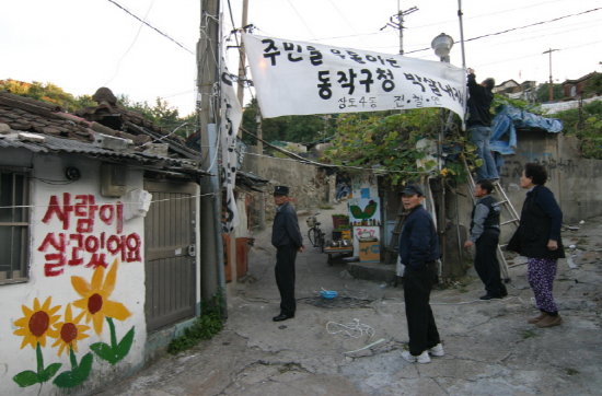 다시 시간이 흘러 작년 9월 30일 상도동의 모습입니다. 이날은 주민들이 모여 집회를 개최하는 날이었습니다. 그리고 저녁 늦게 까지 모여 마을잔치를 개최하였습니다. 일상으로 돌아온 주민들의 모습입니다. 주민들 간의 쌓인 상처를 보듬고 회포를 푸는 날이었습니다. 한 철거민은 마을입구 ‘환희슈퍼’ 앞에 플래카드를 설치하고 다가올 겨울을 준비하고 있었습니다. 이렇게라도 해야 마음이 놓인다는 것입니다. 이미 막걸리 몇 잔에 취기가 오른 마을 어르신은 잠시 후 있을 마을잔치를 앞두고 분주히 손님 맞을 준비를 하십니다.