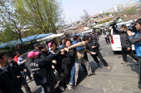 다시 또 몸싸움 폭력, 그리고 또 폭력, 주거권쟁취가 쓰여 있는 조끼를 입은 주민들이 바닥에 쓰러진 모습, 그리고 뭔가 특별한 그림을 잡으려는 듯 한 기자들...