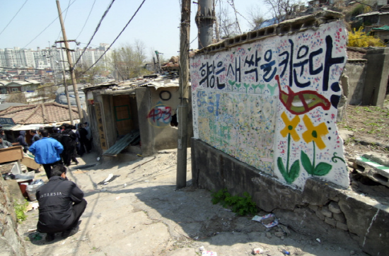 이 지역은 2004년 주택재개발 기본 계획이 수립되면서 현재까지 철거민들과의 갈등이 이어지고 있습니다. 우선 지덕사 종친회 측이 무허가 건물 가옥 주들을 중심으로 결성된 ‘주택재개발 추진위원회’로 땅을 팔아넘기려 했습니다. 그러다 다시 ‘민영재개발’인 ‘지역주택조합’ 사업으로 선회를 하면서 지덕사 관계자와 조합대표 등 관계자가 비리로 줄줄이 구속이 된바 있습니다. 세입자에 대한 보상 의무와 임대주택을 짓지 않으려는 꼼수가 있었던 것입니다. 벌써 몇 년째 이런 상황에서 대안을 마련하지 못하고 딜레마에 빠져 있는 상황입니다.