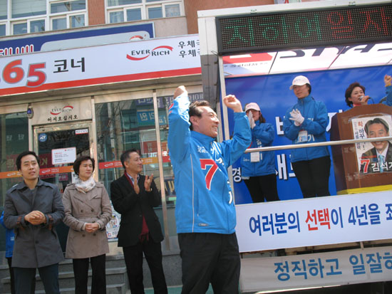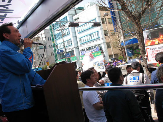 이틀째인 8일 오후 유가족들이 경주역 맞은 편 성동시장에서 선전전을 진행하던 중 김석기 후보측의 유세차량과 선거운동원들이 나타났고 이어 김석기 후보의 모습이 보였다.