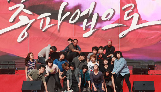지난 1일 서울시청 광장에서 열린 민주노총의 ‘제 122주년 세계노동절 기념대회’에서는 이례적으로 현장노동자 퍼포먼스가 민중의례 직후에 배치됐다. 쌍용자동차와 재능교육, 퀵서비스, 시그네틱스 노동자, 그리고 현장의 율동문선대, 노동예술단 선언(몸짓선언)등이 무대 위에 올랐다. 활자로만 전해지던 죽음이, 관속으로 들어가는 노동자와 그 위에 흩뿌려지는 국화 꽃잎으로 재현됐다. 무대 위에 오른 사람도, 무대 밑에서 지켜보는 사람도 울었다.