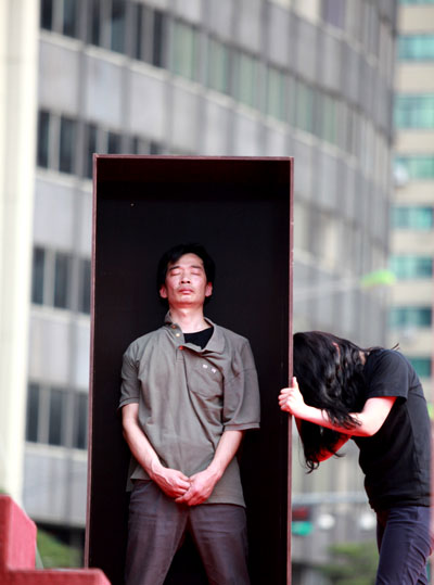 퍼포먼스의 시작은 죽음이었다. 신발과 조끼를 벗고 천천히 죽어가는 노동자와 괴로워하는 동지들. 하지만 그들을 둘러싼 세상은 어떤 감흥도 없다. 대한문 분향소 앞, 재능교육 농성장 앞을 지나가는 사람들과 자동차는 기계처럼 움직인다. 그리고 그룹 ‘메이데이’의 <죽음>이라는 노래가 흘러나온다. “사람들의 죽음이 아무렇지도 않아. 그저 내가 죽지 않았음을 안도할 뿐”
