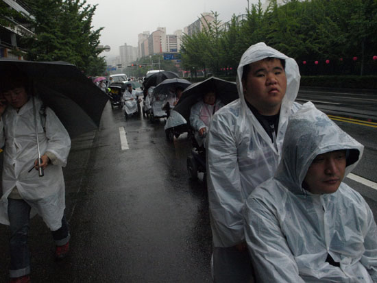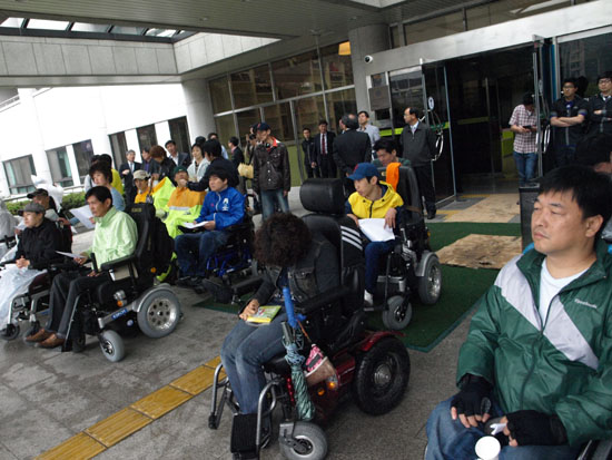 420공투단은 14일 오전 경기도청 앞에서 출정식을 갖고 “동정과 시혜가 난무하며 예산타령만 해대는 경기도와 전면전을 선포한다. 돈이 없다는 이유로 지켜져야 할 법적 차량 대수마저 외면하며 자신의 대권행보만을 신경쓰는 김문수 도지사에게 묻는다. 경기도가 관연 교통복지 1위 운운해도 되는가? 참담하기 그지없는 현실을 우리가 기어서, 걸어서 확인해 보이겠다”며 이번 휠체어 도보 순회투쟁의 의의를 설명했다.