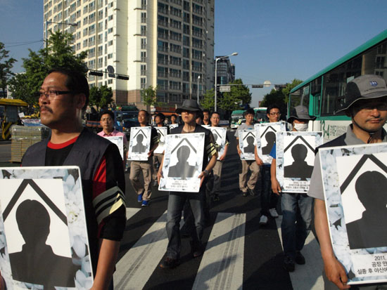 결의대회를 마친 참가자들은 경기도청에서 수원역까지 행진을 하며 선전전을 진행했다. 행진 대오의 선두에는 쌍용자동차 22명의 희생자를 상징하는 영정을 앞세웠다.
