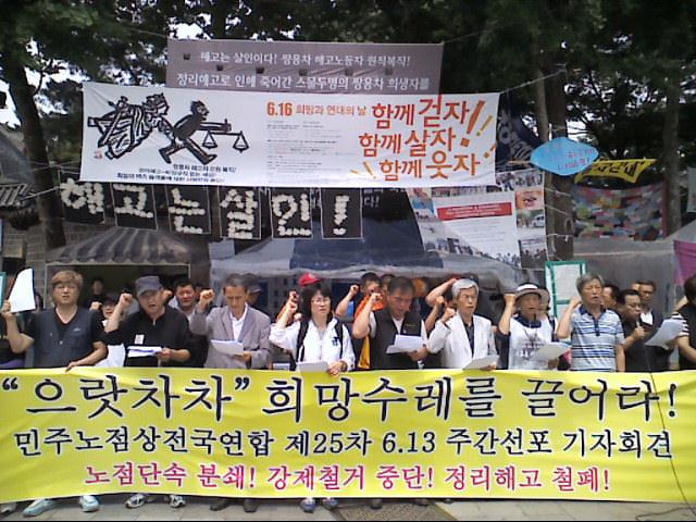 이날 함께 참여한 정의헌 민주노총 수석부위원장은 “수많은 민중들이 생계와 가족의 삶을 지키기 위해 일하다가 쫓겨나는 어려운 삶이 지속되고 있”으며 “작년에만 10만의 노동자가 정리해고됐지만 이들이 무엇을 하면서 삶을 이어나가는지는 알 수 없는 현실”이라며 “개별적인 투쟁이 아니라 세상을 바꾸는 투쟁을 통해 노동자 민중들이 먹고사는 문제를 가지고 내몰리는 세상을 바꾸자”고 힘을 주어 발언했다.