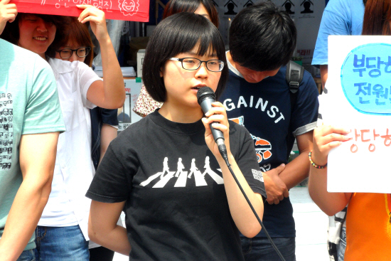 유수진 서울대 사회대 학생회장은 “희생자들에게 사측이 사과하고 약속했던 합의를 이행한다고 사태가 마무리되는 것은 아니”라고 주장했다. 유수진 회장은 “사과와 합의이행이 초점이 맞춰지는 것은 지금까지의 투쟁과정을 흐리게 하는 것”이라며 “불쌍한 노동자들을 도와주자는 마음으로 연대해선 안되고 정리해고 자체가 악법이며 정리해고 자체가 문제라는 문제제기로 이어져야 한다”고 주장했다.