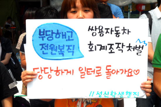 진효 성신여대 인문대 학생회장은 “쌍용차 문제는 과거 정권을 유지하기 위해서 평화의댐 같은 많은 조작사건을 일으켰던 것과 마찬가지로 자본의 위기를 타개하기 위해 상하이 자본이 회계를 조작해 위기의 책임을 노동자들에게 떠넘긴 것”이라고 주장했다. 그녀는 이어 “위기의 책임을 노동자들이 아닌 위기를 만들어낸 자본가와 지배계급에게 물어야 할 것”이라고 주장했다.