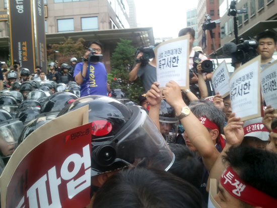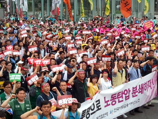 민주노총 조합원 3만여 명은 28일 오후 5시, 여의도 국민은행 앞에서 6.28 경고파업 및 집회를 개최하고 8월 총파업을 결의했다.