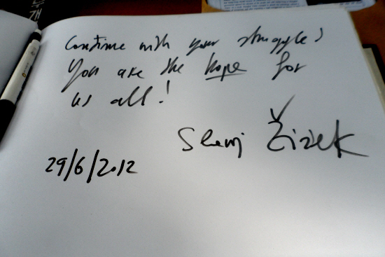 지젝은 분향소 방명록에 “투쟁을 멈추지 마십시오, 당신들이 우리 모두의 ‘희망’입니다”라는문장을 남겼다.