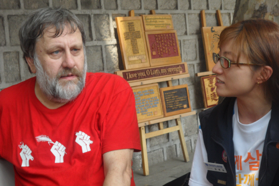 지젝은 한국의 정치상황에 대한 조언도 건넸다. 지젝은 “유럽에서는 경제적 선택권이 주어지지 않는 투표를 거부하는 것이 곧 적극적인 정치참여라고 말하기도 하지만 한국에서는 만약 사회적 약자를 대변하고 노동문제를 해결할 수 있는 정책을 제시하는 후보가 나타난다면 그에게 투표를 하는 것도 하나의 방법일 것”이라고 조언했다.