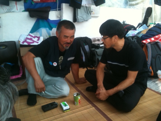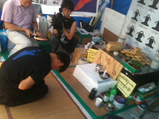한상균 전 지부장은 영정 앞에 분향을 한 뒤 뙤약볕 아래 분향소를 지켜온 김정우 현 지부장과 마음을 나눴다.