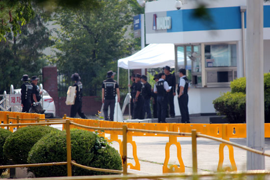 용역직원은 공장 곳곳에 배치 돼 있다. 정문과 지회사무실을 중심으로 담을 따라, 노란 바리케이트를 따라, 여러 무리가 어슬렁거린다. 그래도 오늘은 어제보다 용역 직원이 절반 가량 감소했다는 노조 조합원의 설명이 뒤따른다.
