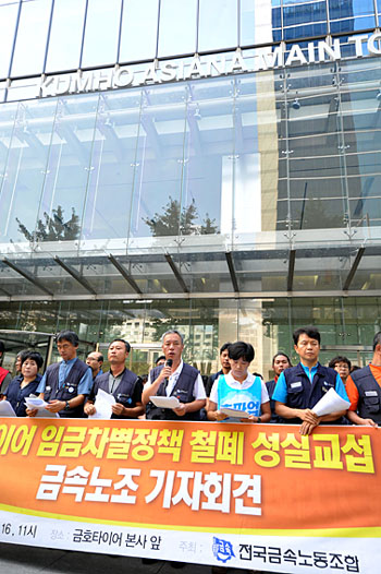 금속노조(위원장 박상철)는 16일 오전 11시 서울 금호타이어본사 앞에서 기자회견을 열고 회사에 임금차별정책 철폐와 성실교섭을 촉구했다. 박상철 노조 위원장은 기자회견에서 “피땀 흘려 회사를 지킨 노동자들에게 피눈물 나는 고통을 전가하는 것이 말이 되냐”며 “정당한 노동자의 요구를 관철하기 위한 합법적인 투쟁을 불법과 폭력으로 짓밟는다면 강력한 투쟁으로 대응하겠다”고 경고했다.