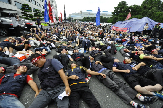 ▲ 17일 오전 현대차지부가 교섭에 들어가기 전 비정규직지회 파업 참가 조합원들이 지부 독자적인 비정규직 정규직화 협상을 반대하며 교섭장 진입로에 드러누웠고 지부가 오늘 교섭에서 그 문제를 다루지 않기로 하자 길을 틔웠다. |