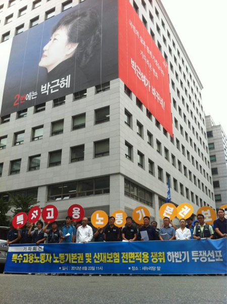 민주노총 특수고용대책위 등은 23일 오전 11시, 여의도 새누리당 중앙당사 앞에서 기자회견을 열고, 새누리당에 노동3권과 산재전면적용을 요구했다. 아울러 요구조건 관철을 위해 하반기 특수고용 공동투쟁에 나서겠다고 밝혔다.