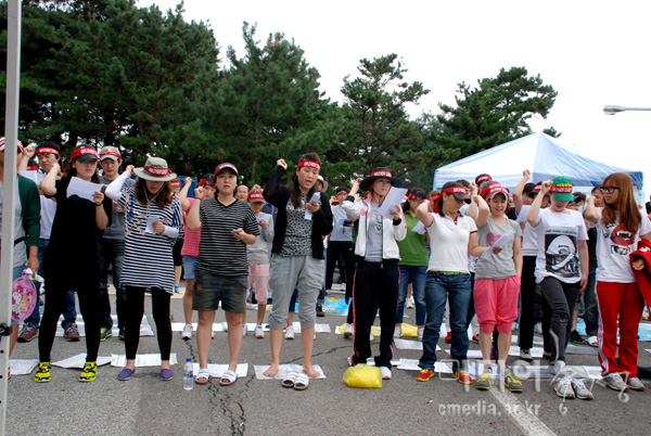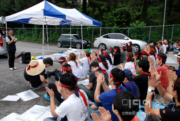 낮에는 더위와 밤에는 비와 싸우며 아침, 점심, 저녁 집회와 문화제를 이어갔다. 후원회에서 준비한 밥으로 배를 든든히 채우고, 가족이나 인근 노동자들이 잘 싸우라며 가져온 빵, 포도, 과자, 커피로 마음도 채웠다. 일요일엔 유성기업 해고자가 요리하는 희망식당 3호 청주점에서도 남은 수육을 싸들고 왔다. 금요일 밤에는 ‘선언’이, 일요일 밤에는 ‘노래하는 노동자’ 김성만이 센싸타를 찾았다. ‘생활교육공동체 공룡’이 전날 찍어 편집해 만든 영상을 틀자 아는 얼굴이 나온다며 킥킥 대다가도 숙연해졌다.