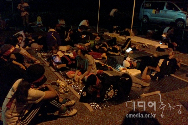 ▲ 새벽에도 순서를 정해 번갈아가며 정문 앞을 지키는 센싸타지회 조합원들 |