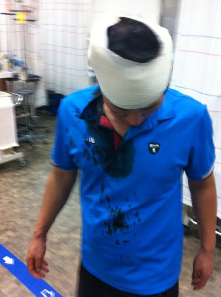 ▲ 소화기에 맞은 부상자 [출처: nodonghb@gmail.com]] |