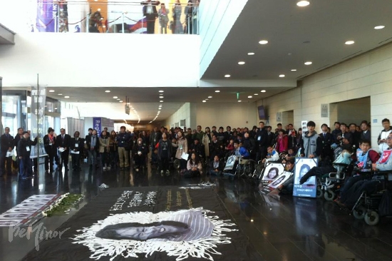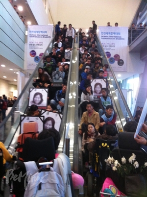 전국장애인차별철폐연대(아래 전장연)은 1일 늦은 1시 송도 컨벤시아에서 ‘활동보조 24시간 쟁취 기자회견’을 연 뒤 2시 30분쯤에 2층에 마련된 고 김주영 활동가 분향소로 이동해 분향을 하려고 했으나 대회 주최 측은 엘리베이터와 에스컬레이터 등 2층으로 가는 통로를 봉쇄했다.