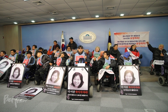 ▲ 새누리당에 활동지원 예산 증액 보장을 약속하라며, 2일 국회 본청 정론관을 점거한 전국장애인차별철폐연대 활동가들 |