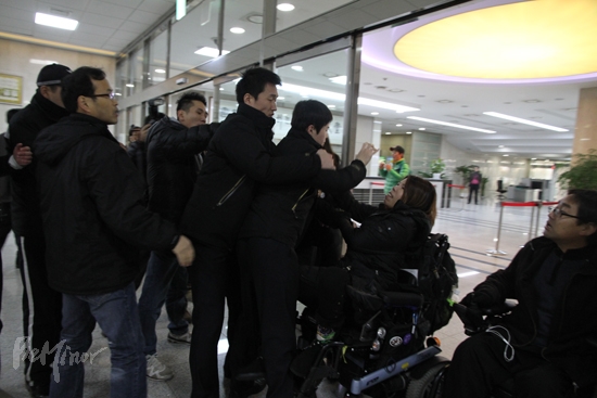 한편, 전장연이 국회 정론관에 기습 진입하는 과정에서 중증장애인들의 진입을 막으려는 국회 측 청원경찰이 장애인들의 휠체어 뒷손잡이를 잡아 휠체어가 뒤로 기울어지고 비장애인 활동가가 멱살 잡힌 채 넘어지는 등 물리적인 마찰이 있었다.