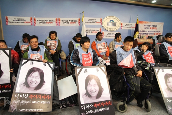 경기도장애인차별철폐연대 이형숙 대표는 "활동보조서비스 24시간 보장이 안 되면 장애인들 죽는다고 90년도부터 활동보조 투쟁을 하며 요구했다"라면서 "그런데 2012년도에 와서 활동보조 예산이 부족해 사람이 죽었다. 활동보조가 없어 평생 문밖에도 못 나오는 장애인들이 여전히 있다. 내년까지 가지 말고 올해 예산을 확보하자"라고 목소리를 높였다.