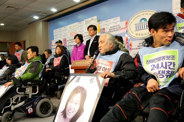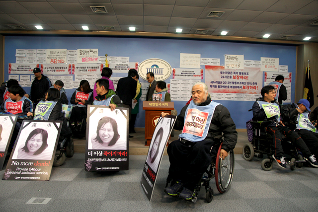 전국장애인차별철폐연대(전장연)는 정론관 기자회견을 통해 “지난 11월 20일 국회 보건복지위 예산소위는 활동보조인이 없어 장애인들이 죽어가는 사태의 심각성을 인식하고, 최중증 장애인들의 하루 24시간 활동지원 보장을 위해 2013년 장애인 활동지원 예산을 2012년 3,099억 원에서 50% 인상을 결의하고, 독거 장애인과 취약가구 등에 대해 우선적으로 24시간 활동지원 계획을 세우도록 부대의견을 제출한 바 있다”고 예산 통과를 촉구했다.