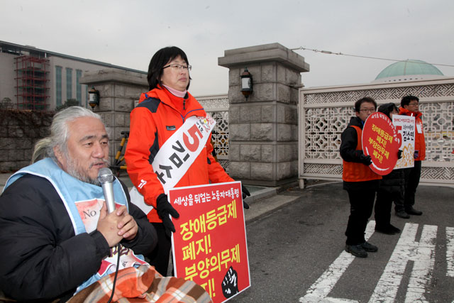 이날 오전 활동보조 서비스 24시간 보장 예산 통과를 촉구하며 국회 기자회견장 점거농성을 풀고 김소연 유세에 함께한 박경석 전장연 상임 공동대표는 “대선에서 모두 다 복지를 얘기하고 있지만, 복지는 복날에 개고기 먹듯이 한때 좋게 이야기하다가 그날 지나면 무슨 일이 있었느냐고 잊어버리는 그런 게 아니”라며 “가난한 사람의 삶과 중증장애인의 삶을 지키면서 복지를 얘기해야 한다”고 새누리당과 민주당의 복지 정책을 비판했다.