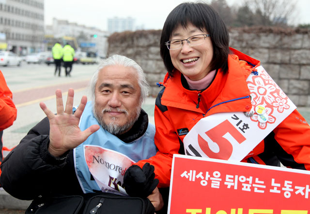 박 공동대표는 “투쟁하는 사람들의 말을 이렇게 투쟁 현장 가까이에서 하도록 하는 후보가 어디 있느냐”며 “이렇게 가까이서 핍박 받고 비정규직과 장애인의 생존권을 지키기 위해 투쟁하는 분이 대통령이 되어야 한다”고 말했다.