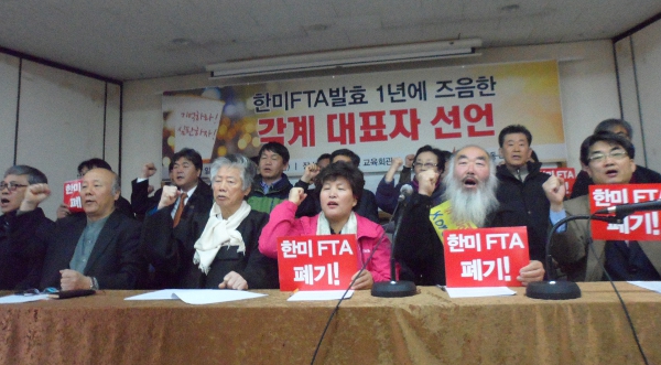 한미FTA저지범국본과 364개 단체들은 15일 오전 서울 프란치스코회관에서 기자회견을 열고 한미FTA 폐기와 재협상을 강하게 요구하고 나섰다. 이 자리에서 박석운 한미FTA범국본 공동대표는 “한미FTA는 아직 끝나지 않았다”며 “재협상부터 폐기까지 관철시키기 위한 전면 투쟁에 나서겠다”고 밝혔다. 그는 또한 “발효 1년을 즈음해 혹세무민하는 성과는 굉장히 초라한 성적이지만 향후 입법, 사법과 경제 주권에 미치는 부정적 효과는 더욱 커질 것이다”라며 새로운 투쟁에 대한 의지를 밝혔다.