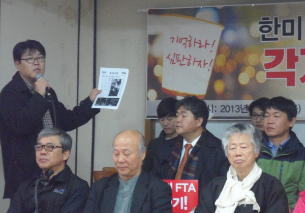김종인 민주노총 비대위원은 “한미FTA가 한국 경제를 살릴 수 있다는 것은 손바닥으로 하늘을 가리려는 행위”라며 “박근혜 정부는 투자자국가소송제(ISD) 폐기에 나서야 하며 그렇지 않을 경우 전국민적 저항에 부딪힐 것이다”라고 말했다.