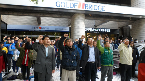 현재 회사 측은 렌트 차량과 용역직원들을 회사 앞에 배치한 상태다. 노조 조합원 및 연대단위는 회사 앞과 로비에서 농성을 이어가고 있다. 김호열 지부장은 “오늘 새벽에도 회사는 노마즈 이사를 내세워 조합원들을 폭행하고 스스로 현행범으로 잡혀갔다”며 “골든브릿지는 헤아릴 수 없는 불법행위를 자행하는 범죄집단”이라고 비판했다.