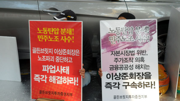 김호열 골든브릿지투자증권지부장은 “보는 대로 회사 앞은 난장판이자 무법천지”라며 “500일 넘게 집회신고를 내고 집회와 농성을 이어왔는데, 회사가 법원 판결에 불복하고 농성장을 강제철거한 뒤 고의적으로 차량과 용역을 배치해 집회를 방해하고 있다”고 목소리를 높였다.