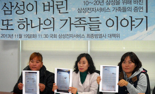 19일 오전, 국회의원회관에서 열린 ‘삼성이 버린 또 하나의 가족들의 이야기’ 증언대회에 참석한 정은숙(43), 김은영(36), 이현아(41) 씨는 남편 이야기를 하며 줄곧 눈물을 흘렸다. 이들은 모두 삼성전자서비스 노동자를 남편으로 둔 여성들이었다.